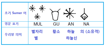 1992> <그림 5 황소자리의 초기 Sumer 어 표기. 출처: skyscript.co,uk 에 추가> 위 그림은 Sumer 어로 “하늘의 황소” 를