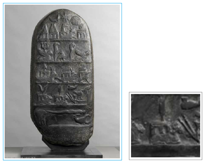 있던 Elamite 왕조시대 BC 2500년경에 제작된 것으로, 당시의 별자리들을 표시한 것입니다. 청색 사각형 표시한 부분 두 개가 금성을 나타낸 부분입니다. 이 그림은 위의 <그림 3> 과 비슷하지만, 여기서는 일출 일몰이 아니라 태양과 달 그리고 금성을 나타낸 것이라고 합니다. 오른쪽 사람은 금성을 경배하는 사람이라고 합니다. <그림 4 Sumer 동부지역 Elamite 왕조시대 점토판 모사도. Louver 박물관. 출처 : Gods, Demons, Symbols of Ancient Mesopotamia / Jeremy Black, Anthony Green / University of Texas press / USA /